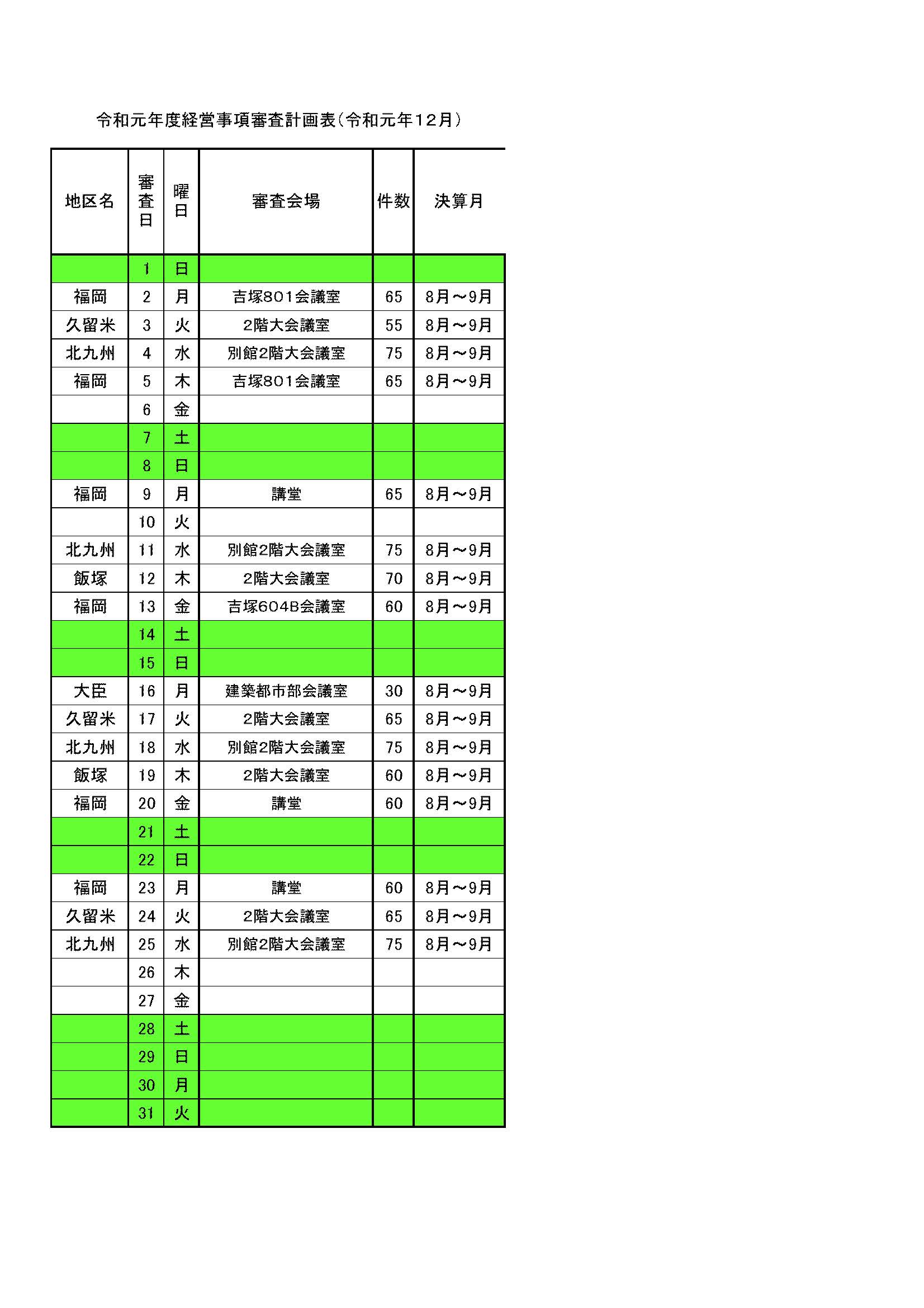 令和元年12月度 福岡県経営事項審査日程表 公開日:2019年11月20日 経営事項審査 福岡県の経営事項審査、令和元年12月度の日程表です。 12月は、決算月7月~8月の建設業者様が中心となります。 ※福岡県ホームページより 関連記事 令和元年11月度 福岡県経営事項審査日程表福岡県平成30年度経営事項審査経営事項審査 平成29年度定期受付は今週で終了令和3年度経営事項審査について経営事項審査 12月日程平成30年4月度福岡県経営事項審査日程 投稿ナビゲーション 令和元年11月度 福岡県経営事項審査日程表令和3年度経営事項審査について