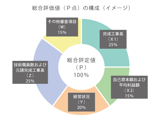 経営規模等の各評点と、経営状況の評点に定められた係数を掛けて得た数値が総合評定値(P)です。